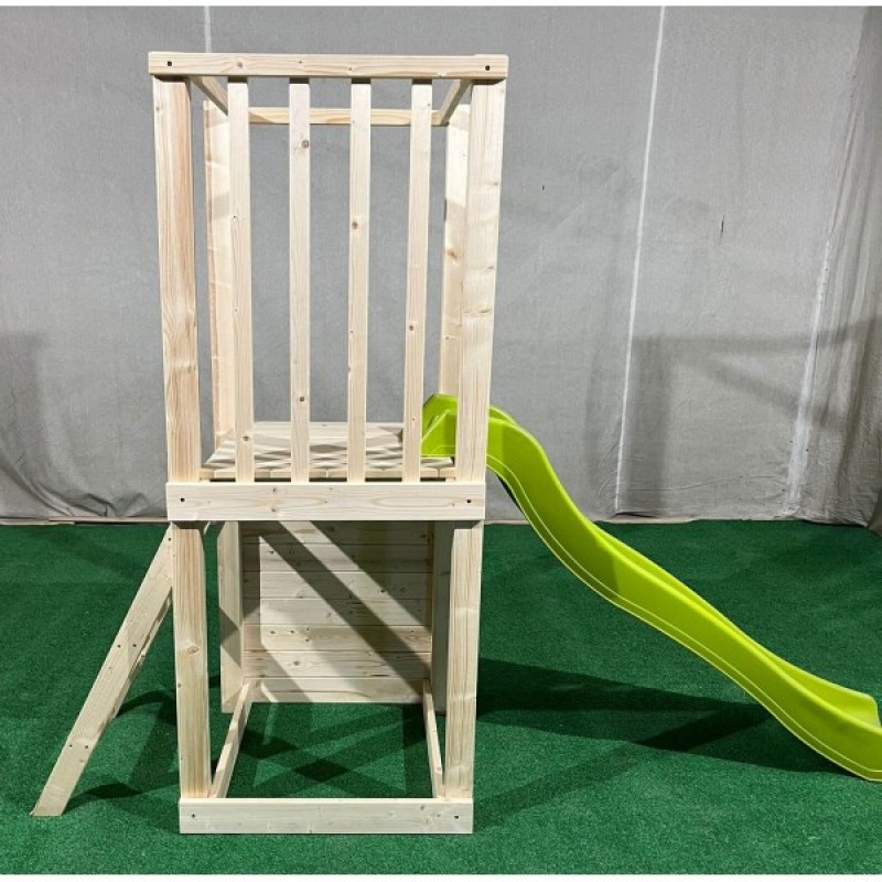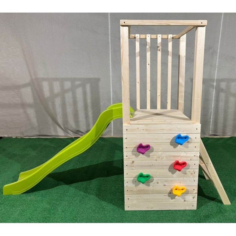 Mini turnul este realizat din lemn de brad si se vinde natur. Prizele de catarare sunt incluse, iar toboganul este doar de prezentare, nefiind inclus in pret.