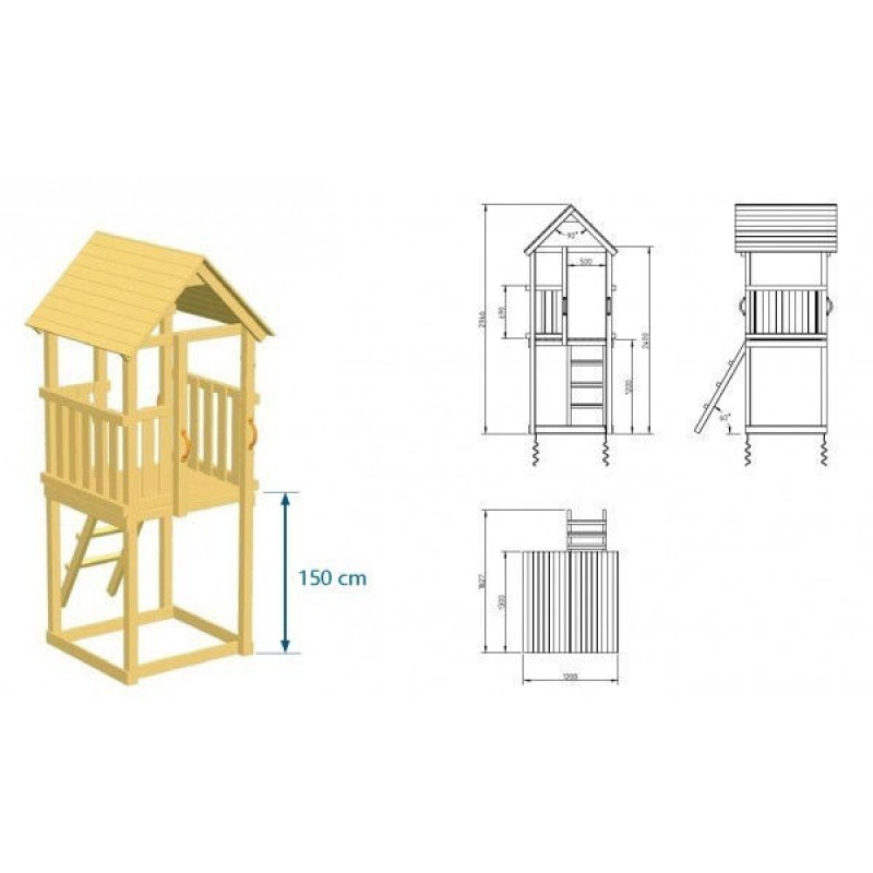 Turnul este realizat din lemn de brad/molid tratat si resistent la insecte, mucegaiuri, ciuperci si umiditate. Pretul include: materialul lemnos taiat la dimensiune cu specificatiile produsului, organe de asamblare, manere de siguranta, ancore de prindere in pamant si tobogan. Toate celelalte accesorii si module din pozele de prezentare nu sunt incluse.