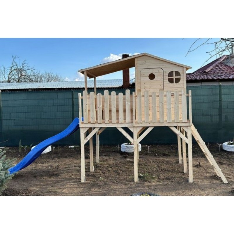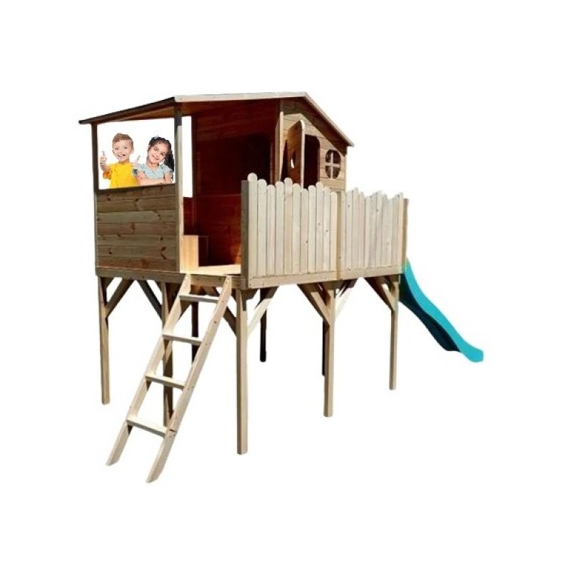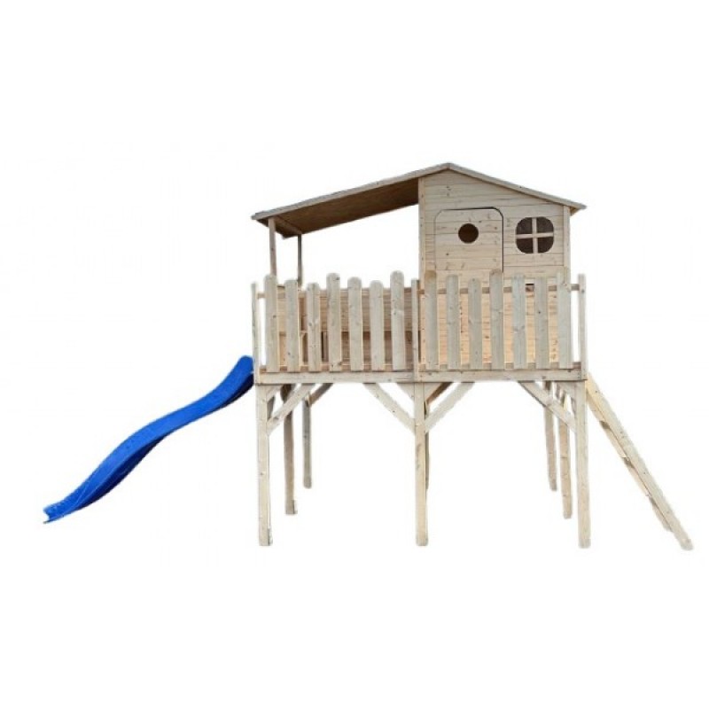 Casuta din lemn pentru copii, cu piloni de 120 cm inaltime, terasa acoperita, veranda si scara de acces.