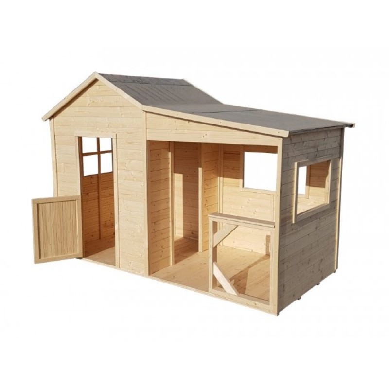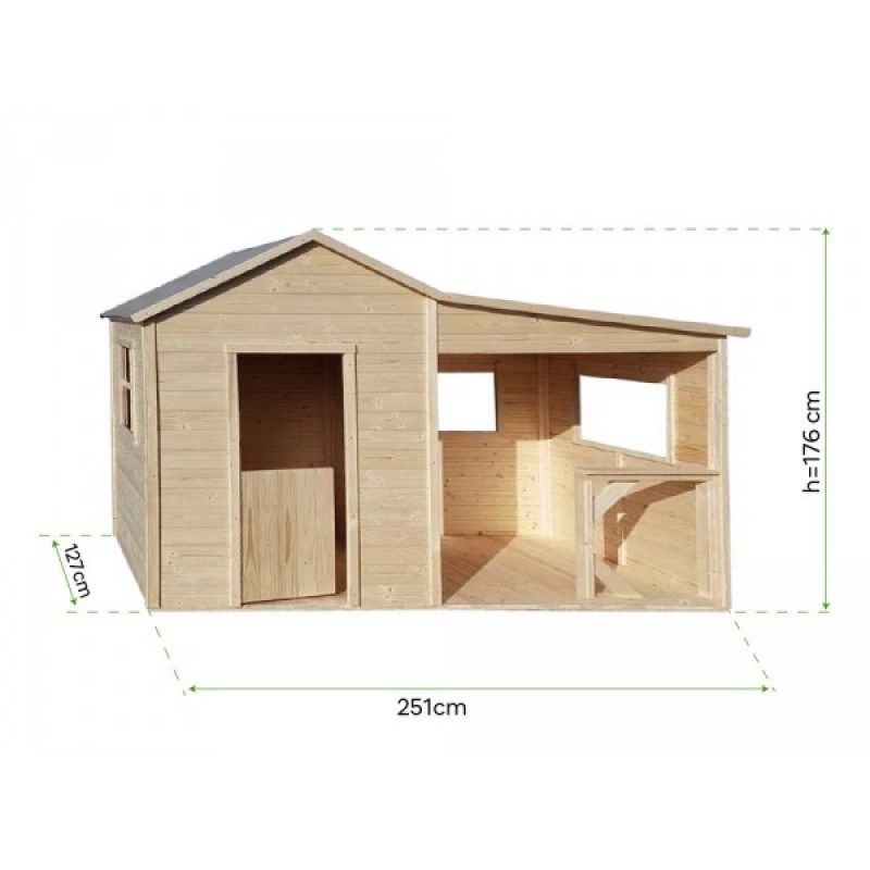 Casuta din lemn pentru copii, prevazuta cu terasa acoperita. Se vinde nevopsita (natur). Dimensiuni: (L) 251 x (l) 128 x (H) 176 cm
