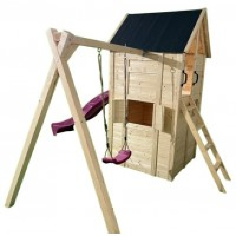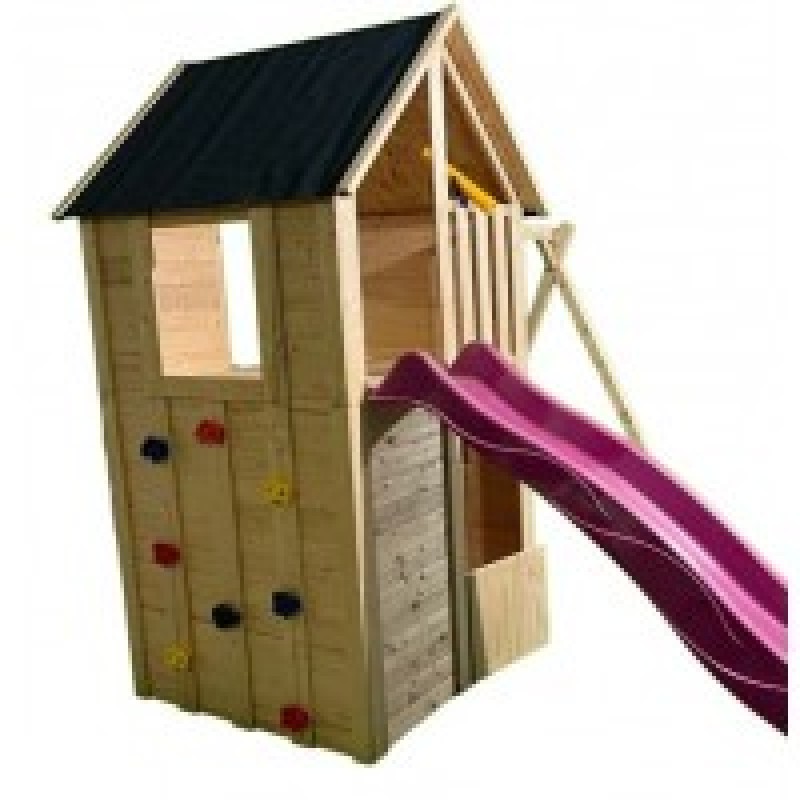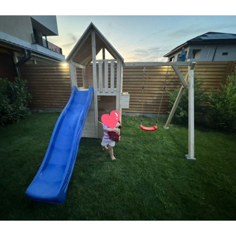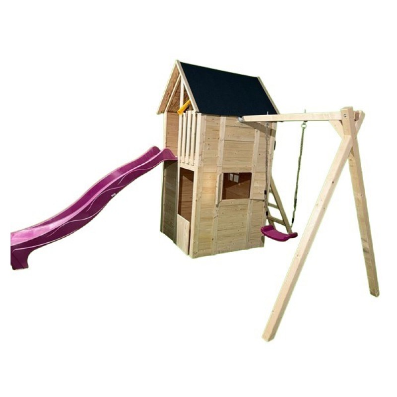 Complex de joaca din lemn, cu casuta, turn, tobogan si ansamblu cu leagan. Casuta este in partea de jos a turnului. Produsul se livreaza dezasamblat si se monteaza conform schitei de montaj din colet. Realizat din lemn de brad.